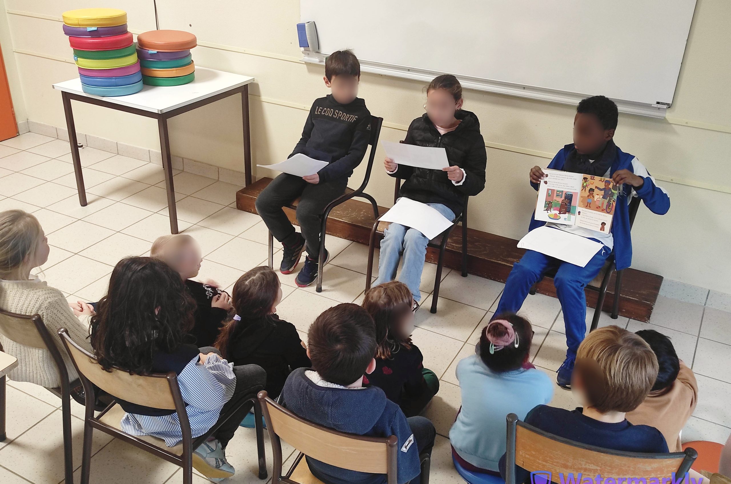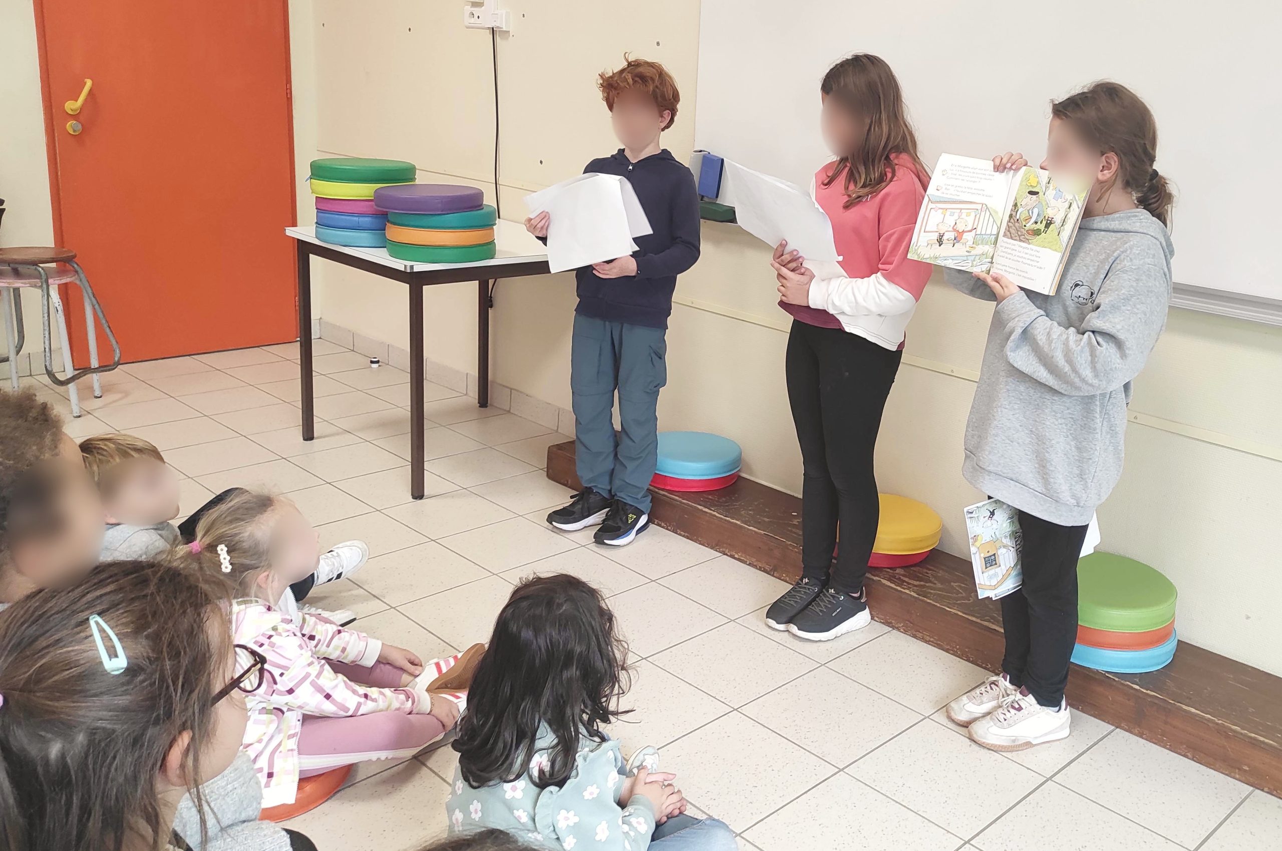 Les grands s’installent enfin devant les élèves de CP. Pour les CM2, c’est une vraie responsabilité : lire clairement pour être compris, guider les plus jeunes, répondre aux questions.